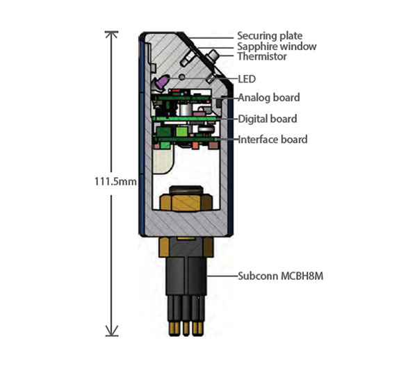 安德拉溶氧探头基于生命周期的荧光淬灭测量原理。它采用铂卟啉配合物作为荧光材料,嵌入在透气的荧光膜中,一层黑色的光隔离涂层保护荧光材料不受太阳光和水中颗粒荧光的影响。荧光膜一侧暴露于环境水体,另一侧安装在测量室的光学窗口上。通过蓝光激发荧光膜上的荧光材料,使其发出红光,检测器检测从发出蓝光到释放出红光的时间,该时间与溶氧浓度呈线性相关性,再经过温度补偿后得出溶氧浓度。基于生命周期的荧光淬灭测量原理与电化学传感器相比具有如下优点: